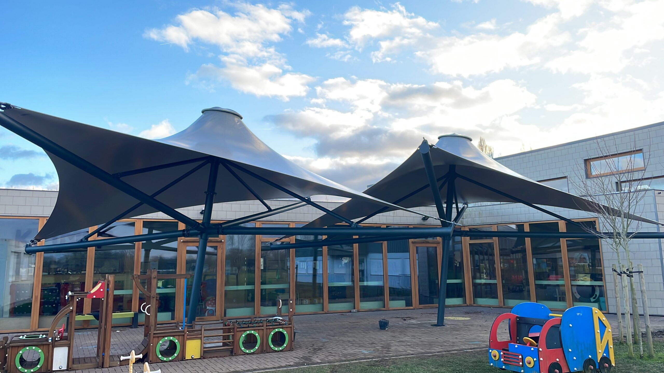 Veilig buiten spelen met UV-werende overkappingen.